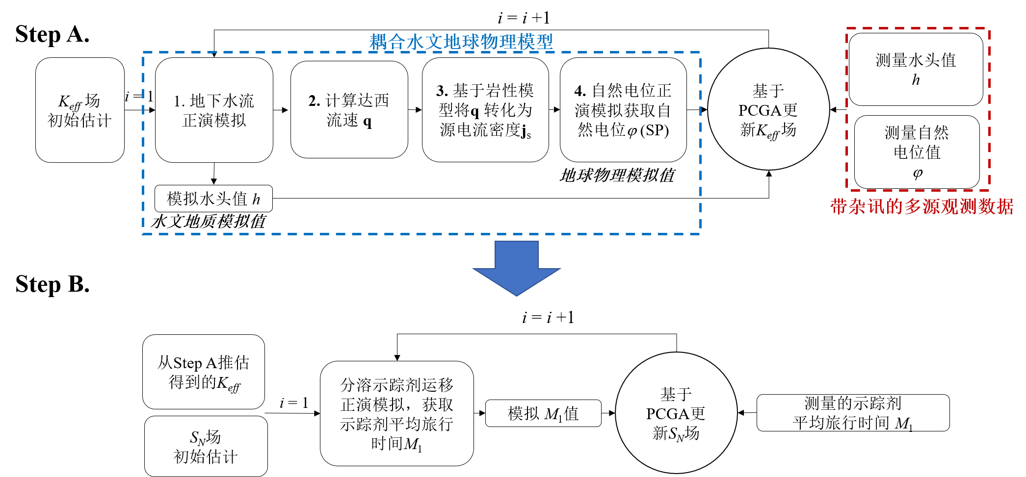 图1. 联合水文地球物理数据与传统水文地质数据精细刻画DNAPL污染源区结构的数据同化框架