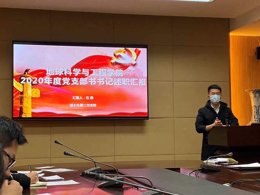 接着,石静同志作为博士生第二党支部向全体支部党员做了述职报告,详细讲述了支部这一年的基本情况变化。首先概括介绍了本支部情况,包括党员、入党积极分子人数的变化、各专业分布情况;梳理并引导大家回顾了党支部这一年组织的各类主题党日学习活动,如助力抗疫的“四个一”活动、建言“第一个南大”的云课堂活动、“学四史”主题微党课活动、一二九朗诵等等。石静同志重点提到,为响应学校提出的党建信息化,本支部已开始使用智慧党建管理服务平台,用于提交党费、管理党员发展等。石静同志对支部之后的发展也作出了规划。