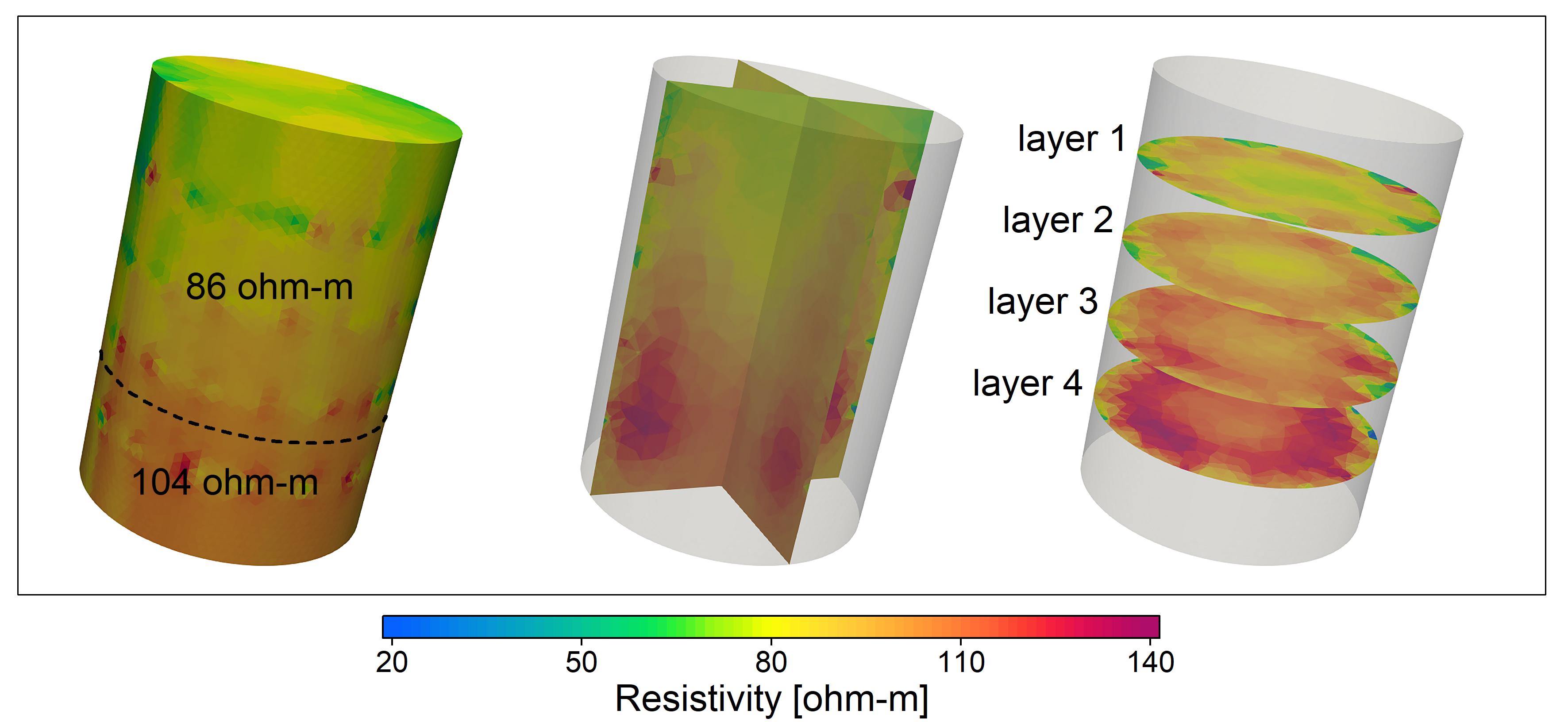 电阻率层析成像 (ERT)是一种非破坏性的地球物理方法,在监测 MICP处理方面具备较大的潜力。为此,新葡的京官网唐朝生教授课题组采用自主开发的ERT测试及反演系统,在国际上率先实现了微生物改性砂土全过程的持续精细监测。通过采集不同处理阶段的直流电阻率信号,利用电阻率模型直观地表征了微生物浆液在砂土中的时空迁移与分布特征。此外,研究发现电阻率变化与MICP处理过程中的尿素水解和碳酸钙沉淀有较好的对应关系,处理后的电阻率分布特征与碳酸钙沉淀分布特征呈现较好的一致性。基于上述试验结果,揭示了微生物诱导碳酸钙沉淀影响砂土电阻率的机制,并进一步构建了二者之间的定量关系。