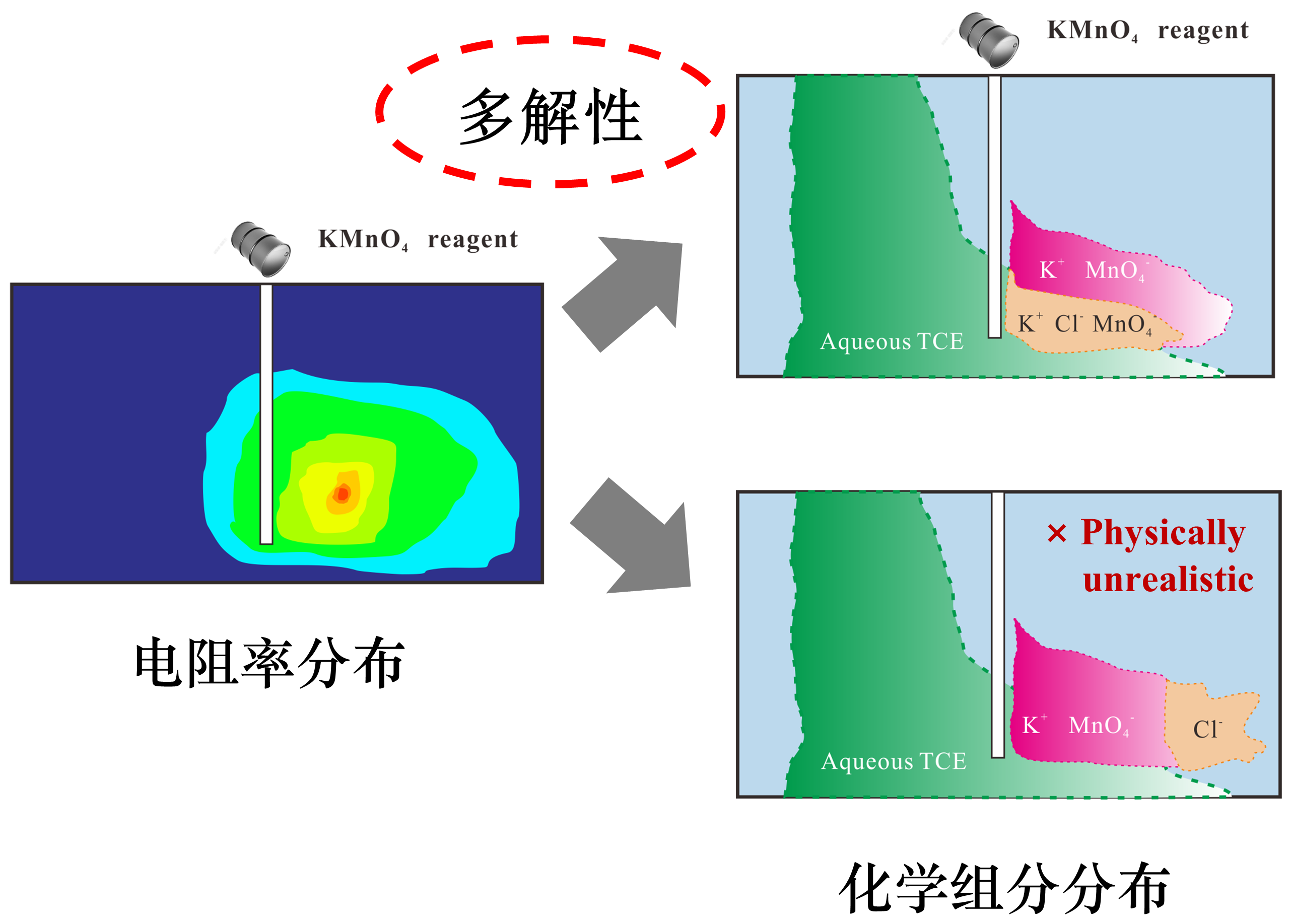 传统侵入式钻孔监测方法仅能提供有限的采样点信息(以点代面),难以全面反映污染物和修复剂的迁移转化动态。电阻率层析成像法(Electrical Resistivity Tomography,ERT)能够探测有机污染修复所引起的地下水化学组分变化,且空间覆盖范围广,为污染场地的修复治理提供了一种快速、廉价、无损的监测手段。然而,ERT仅能反映修复过程中地下水化学组分变化所导致的综合平均化电性响应,无法区分和量化不同化学组分含量(例如污染物、修复剂以及降解产物)。因此ERT方法仅限于粗略的定性监测,难以用于准确定量评估修复效率。目前尚缺乏有效手段来解决ERT数据多解性的问题。