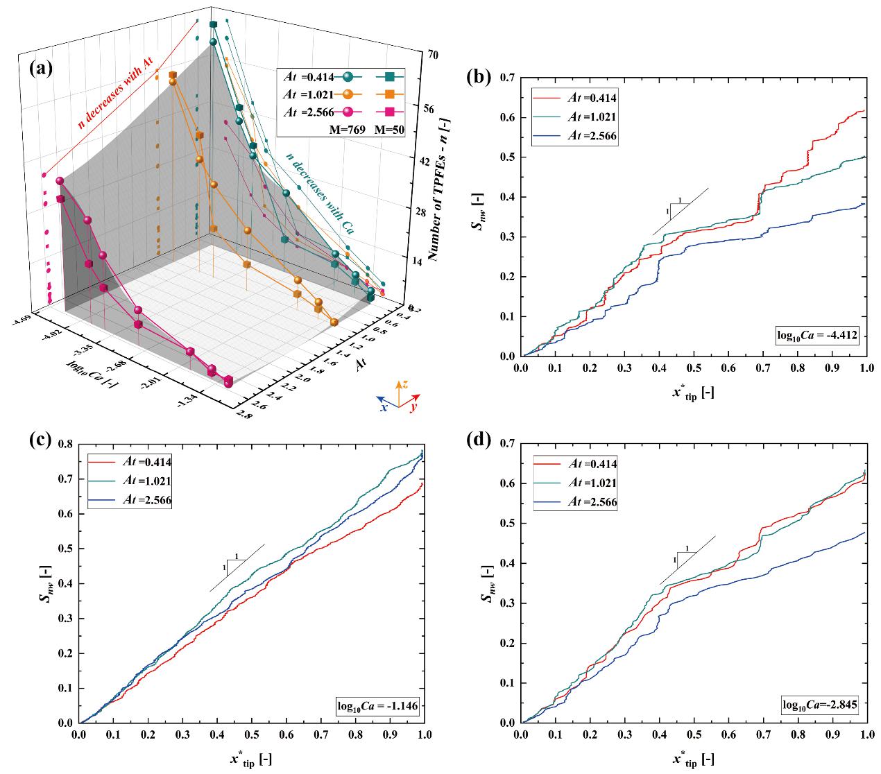 3. 裂隙开度场各向异性对临界毛管数(CaCF-CZCaCZ-CD)的影响以及考虑裂隙开度场各向异性(At)、粘度比(M)和流速(Ca)的三维驱替模式相图